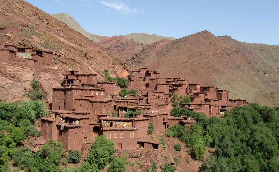 8h00 : Départ pour la randonnée, nous traversons le village de Megdaz à 1950m, « un des plus beaux du Haut Atlas » avec ses superbes maisons à étages, ses hauts greniers rouges et ses noyers centenaires.